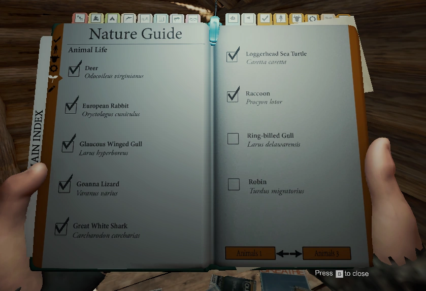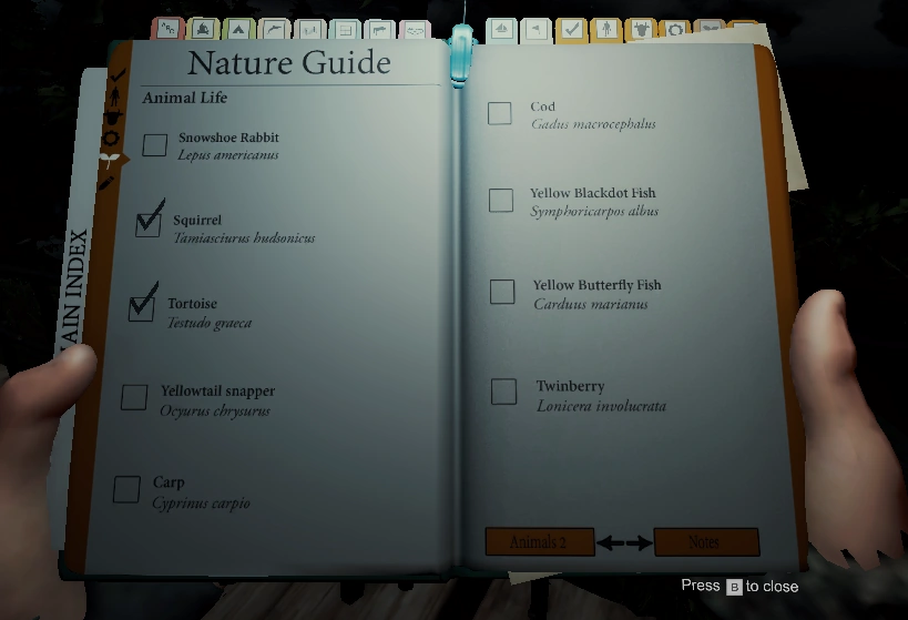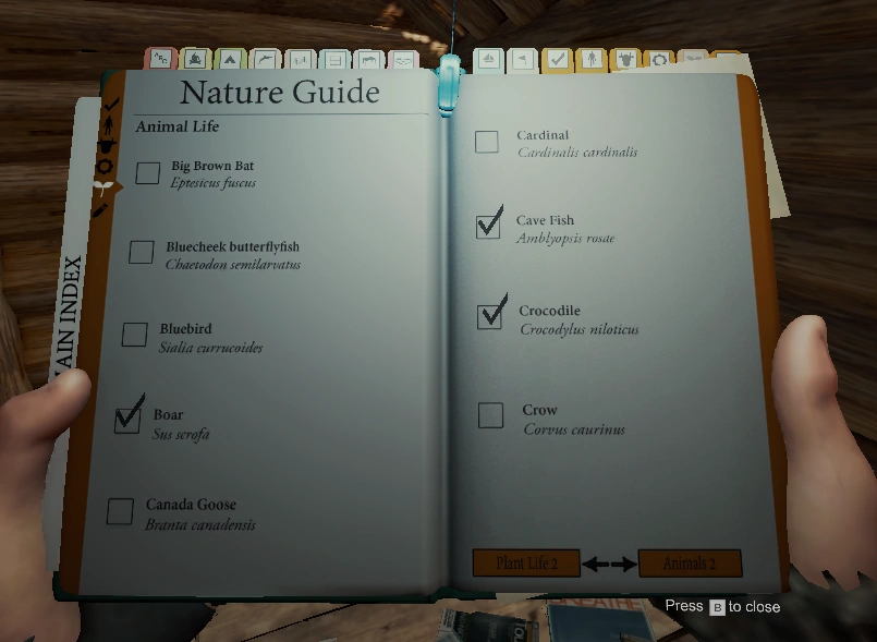 Глава разделена на две части, первая из которых содержит две страницы с растениями, а вторая, три страницы с животными. Каждый пункт растений и животных имеет флажок рядом с названием, который автоматически устанавливается, как только игрок находит тот или иной предмет из списка. Выбор обуславливается есть ли новое растение или новый вид животного соответственно.