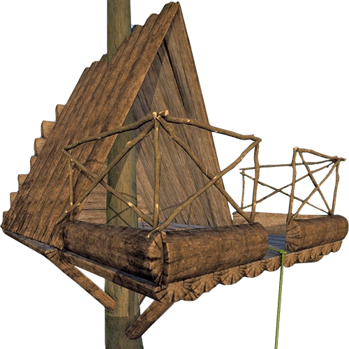 | Самое большое убежище на данный момент. Имеет 2 окна и одну дверь. При постройке убежища можно регулировать его высоту, размещая его выше или ниже. Но если вы построите на максимальной доступной высоте, то вам надо будет найти 186 бревен. Чтобы залезть на такую высоту, можно использовать мостки или веревку. Третий в книге выживания, в категории убежищ. | На земле: